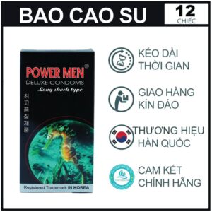 Một sản phẩm bao cao su chống xuất tinh sớm của Hàn quốc – Bao cao su Cá Ngựa Powermen gai, kéo dài thời gian. Sản phẩm được thiết kế siêu mỏng, giúp người sử dụng vẫn giữ được cảm giác chân thật nhất. Với 7% thành phần hoạt chất benzocain có trong mỗi bao cao su sẽ giúp nam giới cải thiện tình trạng “chưa đi chợ mà đã hết tiền”, kéo dài cuộc yêu