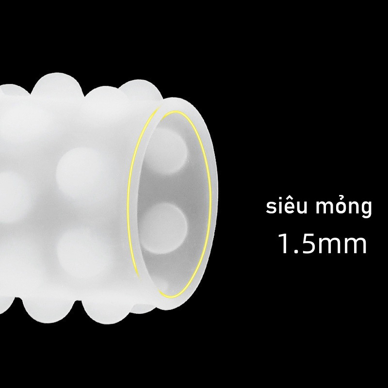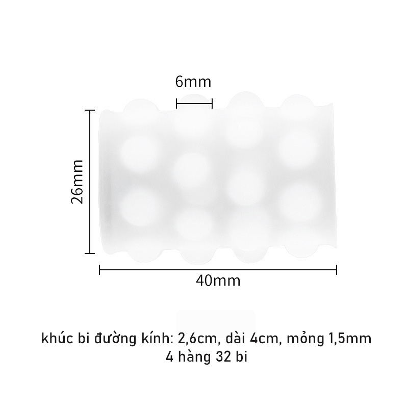Khúc giữa có 32 bi bằng cao su y tế chắc chắn khó đứt có thể dùng lại nhiều lần, co dãn vừa phải đường kính vòng 2,6cm, kích cỡ vừa với hầu hết đàn ông VN, độ dày 1,5mm vừa đủ chắc và ôm sát, đeo vào dưới khấc hoặc đoạn giữa dương vật làm tăng kích thước và tạo ra ma sát kích thích chị em tăng khoái cảm