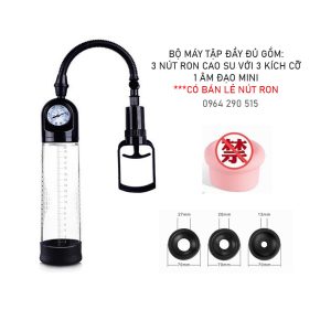 Một bộ máy tập đầy đủ sẽ bao gồm: 1 vòng cao su, 1 âm đạo silicon, ống chân không và bộ tay cầm kéo